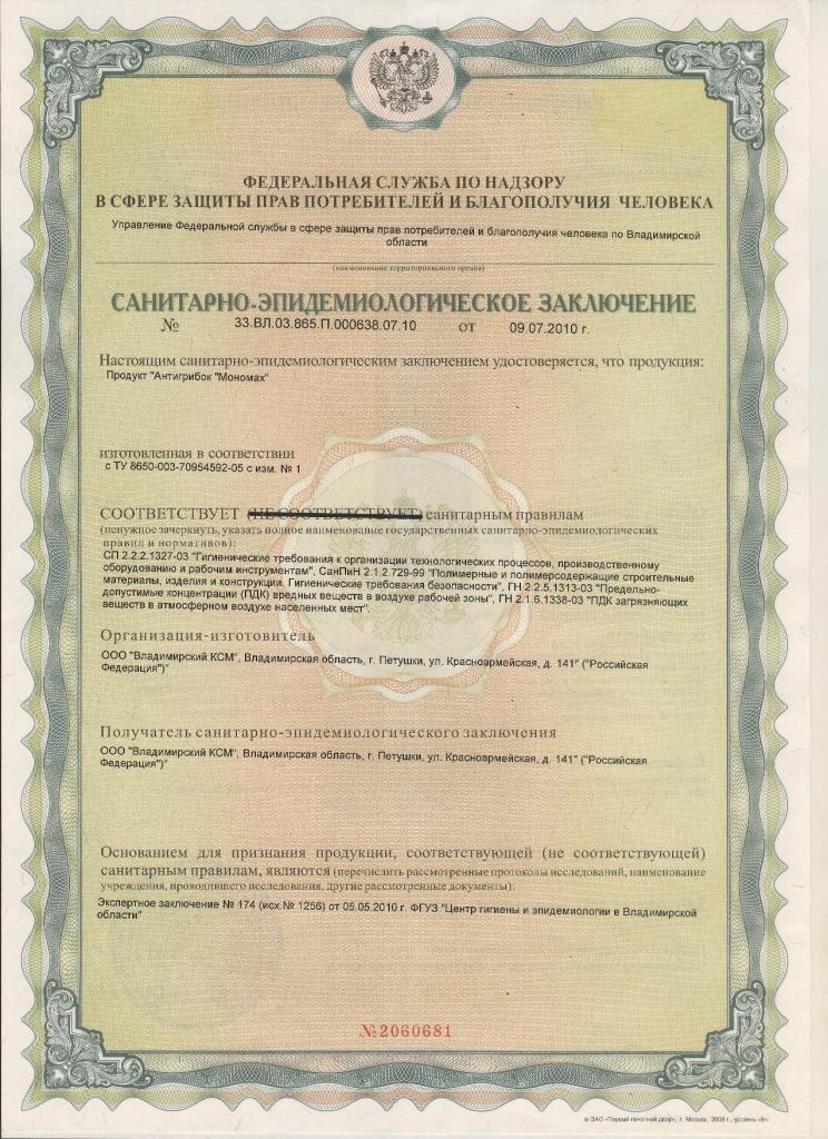 - Санэпид. заключение (антигрибок) от 09.07.2010