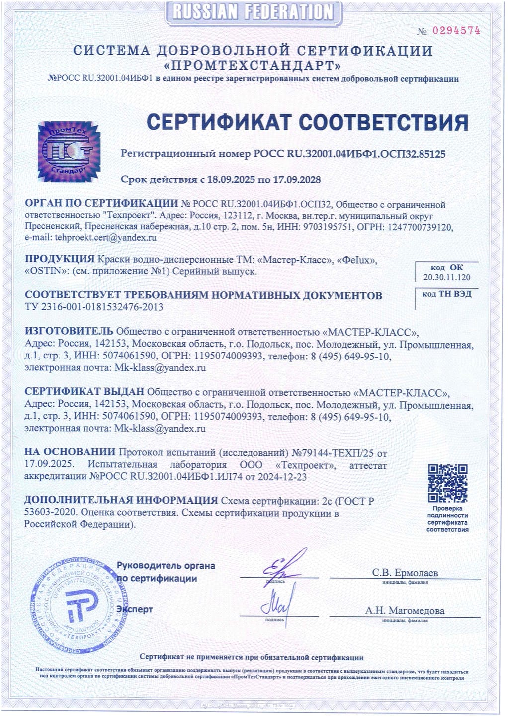 - Сертификат соответствия (Acryl Matt) до 22.12.2027
