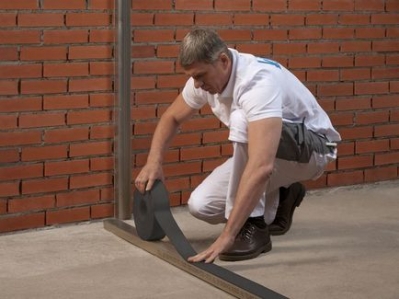 Приклейте на задней части стойки и направляющих профилях, примыкающих к стенам пола и потолка, герметизирующую полиуретановую ленту KNAUF-Dichtungsband. Лента нужна для плотного прилегания к основанию и дополнительной звукоизоляции.