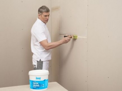 Нанесите грунтовку Knauf-Tiefengrund на стыки гипсокартона первого слоя.